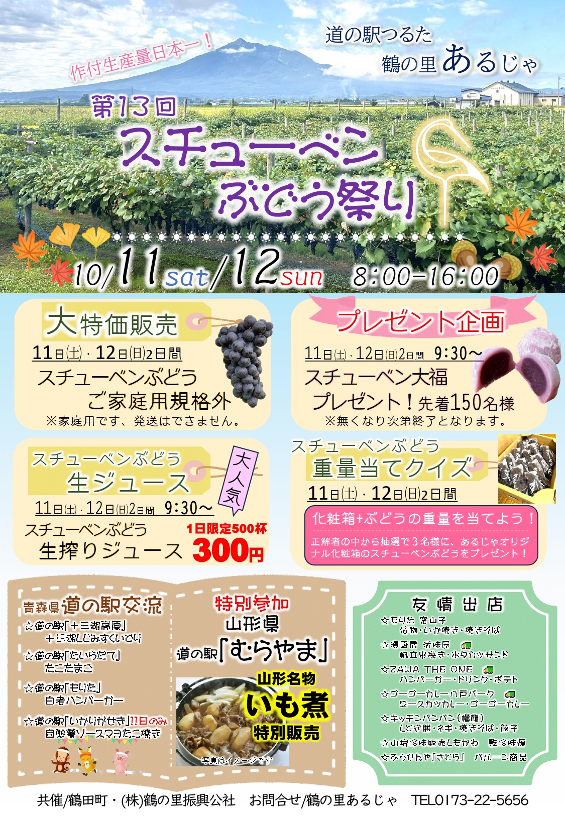 今年も道の駅つるた「鶴の里あるじゃ」において、10月11日(土)、12日(日)、第13回スチューベンぶどう祭りが開催されます。