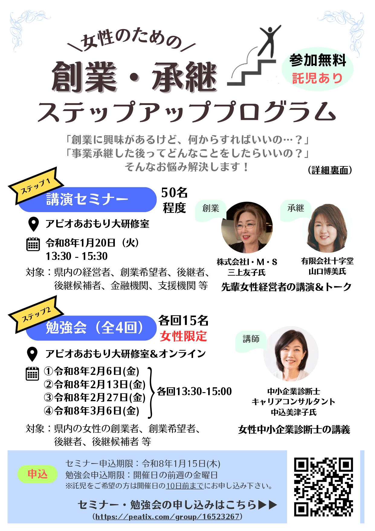 対象:県内の女性の創業者、創業希望者、後継者、後継候補者等