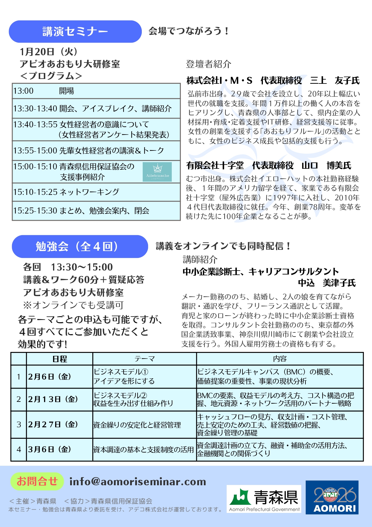 青森県では、そんなお悩みを解決するため、「女性のための創業・承継ステップアッププログラム」として、先輩創業者・事業承継者が講演するセミナーを開催するとともに、女性の中小企業診断士が講師となる勉強会を開催します。