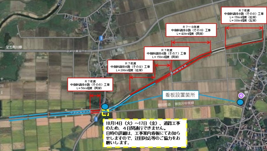 東北農政局主体の水路改修工事に伴い、9月22日(月)から9月25日(木)までの4日間通行止めになります。